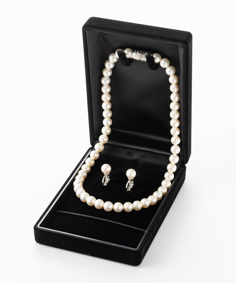 淡水貝の貝核を使用し、限りなく真珠の質感に近づけたネックレスとイヤリングのセットです。留め具はマグネット式で着脱しやすいシンプルなデザイン。