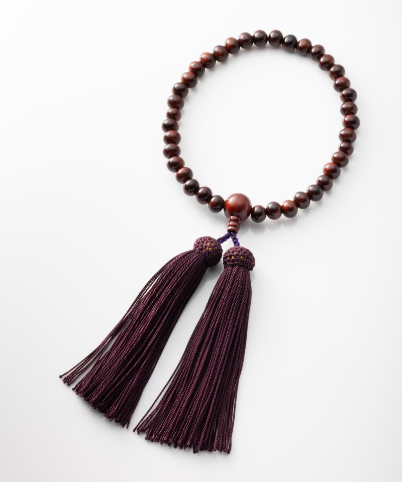 赤茶色の美しい木目が特徴の「紫檀」を使用した京念珠です。天然石の御念珠とは一線を画し、「和」を感じさせます。「古代紫」色の房を合わせることで全体をシックにまとめ上げた、ミセス世代におすすめしたい一品です。