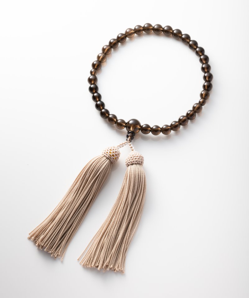 モーキークオーツとも呼ばれる茶水晶を使用した京念珠です。「京房ひも」の職人が製作した正絹頭付の房をあしらい、エレガントで洗練された印象を与えてくれます。周りの方と被りにくい希少な一品です。