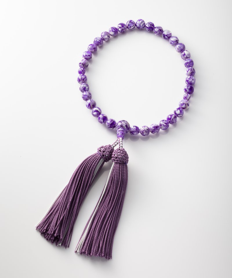 「紫貝(むらさきがい)」と呼ばれる貝殻を特殊な加工で仕上げたラベンダーシェル玉は、他の数珠とは一線を画す唯一無二の存在。同じものが無い特別な京念珠です。シェル(貝殻)の凹凸感とオーロラのような「マーブル模様が存在感を感じさせます。房には正絹を使用した灰紫色を合わせ、落ち着きのある仕上がりに。
