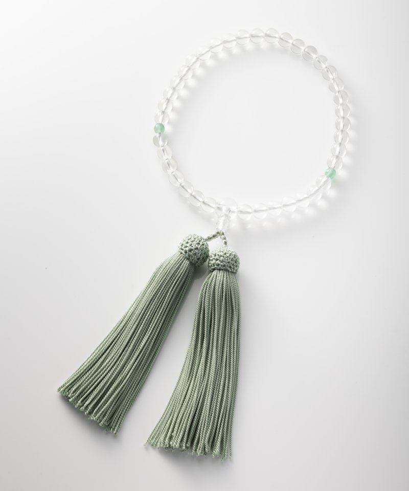 瑞々しい透明感が魅力の天然石「本水晶」を主玉に、アクセントとしてインド翡翠(ヒスイ)をあしらった京念珠です。控えめでシンプルなデザインが魅力の一品です。