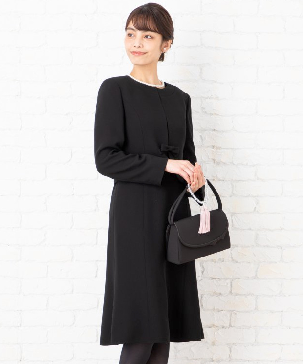 コンパクトなジャケットとセミフレアーワンピースのアンサンブルスーツです。やや短かめのジャケット丈は、全体のバランスが取りやすく細身の方、小柄な方におすすめのデザインです。