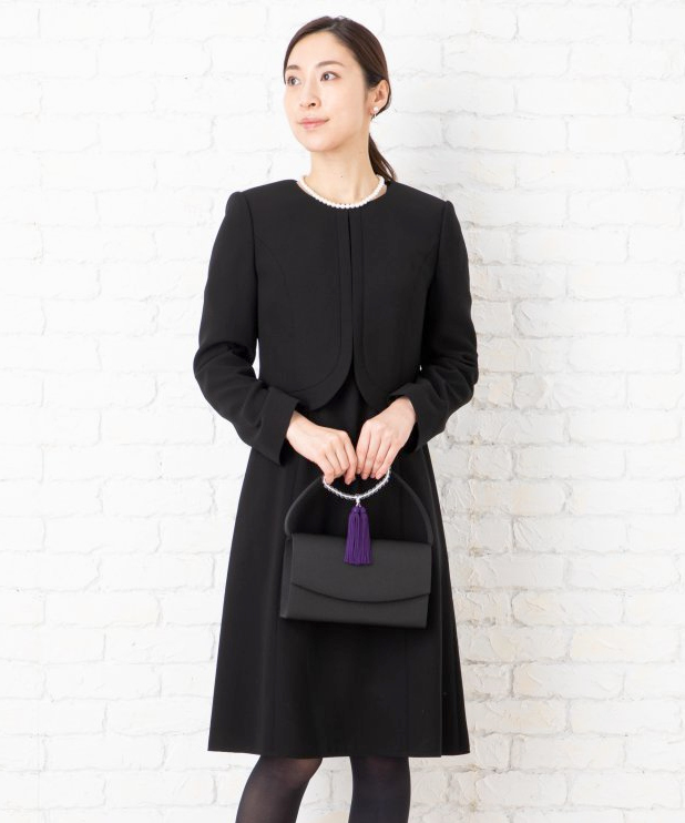 『二重織』を使用した、オールシーズン着用可能なブラックフォーマルアンサンブルです。コンパクトに作られたノーカラージャケットは、縁にパイピングが施されたシンプルなデザイン。