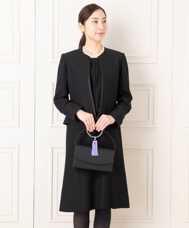 ゆったりと着ることができるシフォンブラウスのワンピースに、シックな光沢感のあるパイピングジャケットを合わせた、デザイン性のあるブラックフォーマルスタイルです。