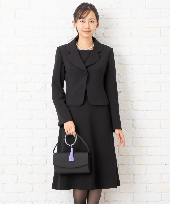 女性らしい柔らかな印象を与えてくれるラウンド仕立てのテーラードジャケットに、美シルエットのAラインワンピースを合わせたブラックフォーマルアンサンブルです。