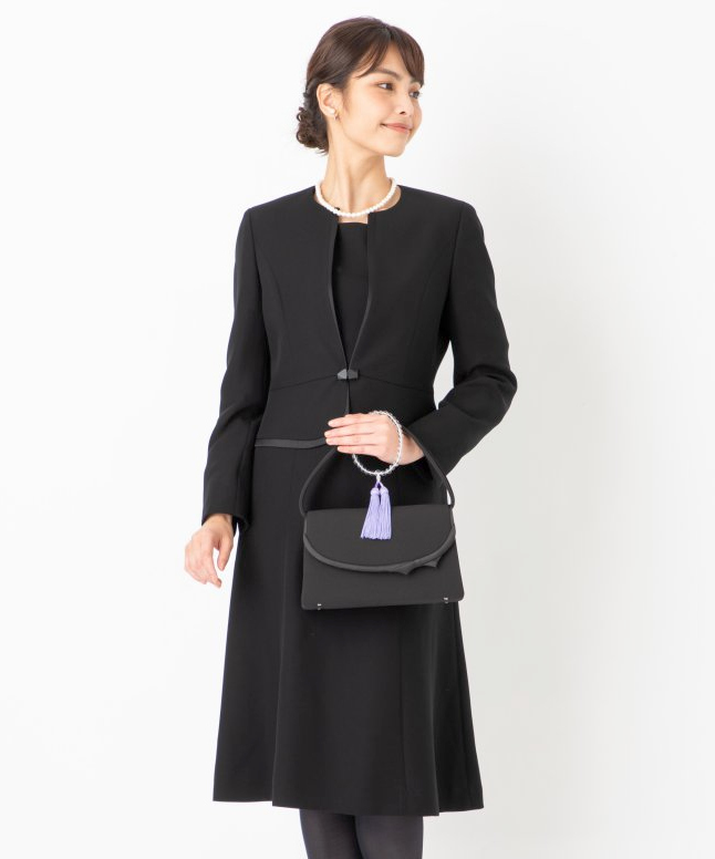 ワンピースはほどよいスクエアネックデザインでしっかりとした印象を与えてくれますので、かしこまった場にも相応しい一着。