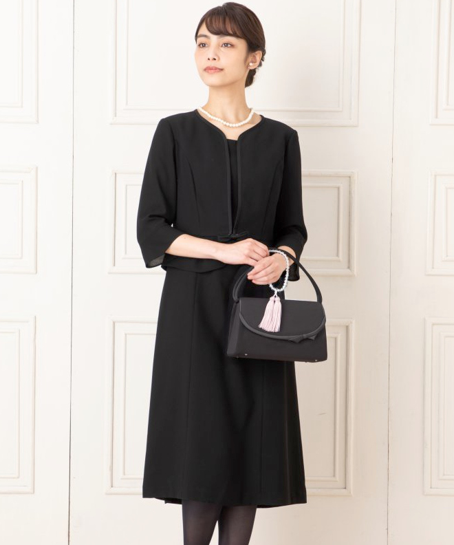 ジャケットとワンピースが一体となったドッキングデザインで、きちんとした印象を損なうことなく、ワンピースと同じ感覚で着て頂けます。袖部分は透けすぎないほどよい透け感のシフォン生地で清涼感もありますので、夏のブラックフォーマルにおすすめの一着です。前開きファスナー仕様で着脱も簡単、授乳もできます。リボンブローチは取り外し可能です。