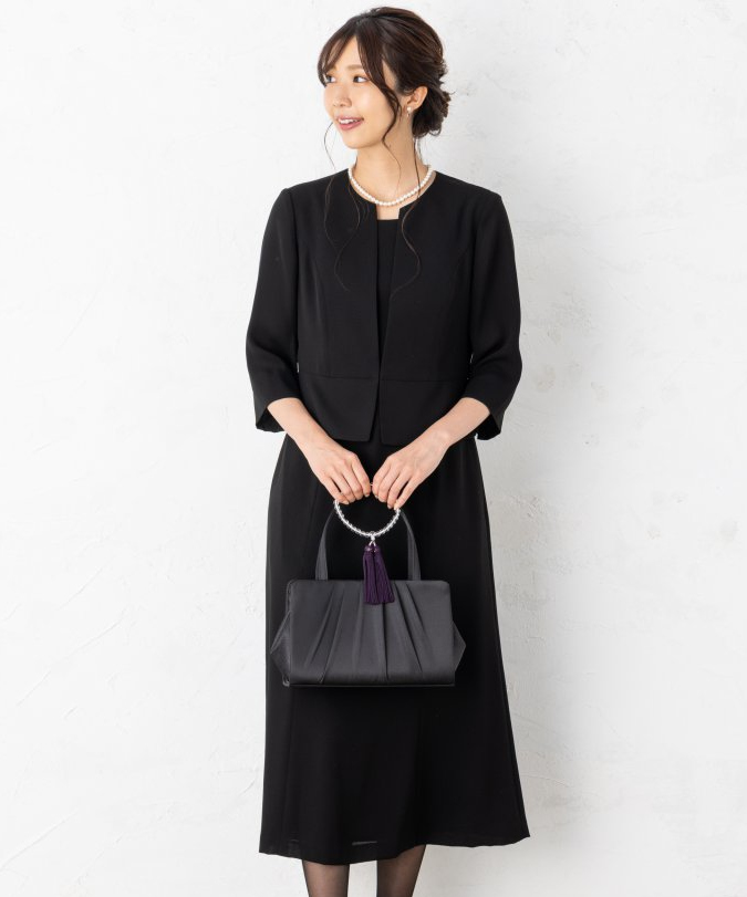 キーネックカラーのジャケットとワンピースが一体となった春夏用の準喪服です。長めの着丈で足元をしっかり隠したい方へおすすめの一着です。