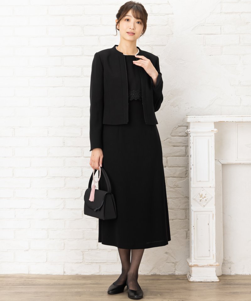 ワンピースはハイウエストからの切り替えで脚長効果が抜群。たっぷりの着丈で脚元までカバーしてくれます。腰回りにゆとりをもたせたシルエットですので、ウエストラインもひろい過ぎません。ジャケットのホックを外していただくと胸元のレースがさりげなくのぞき、アクセントとなるデザインです。