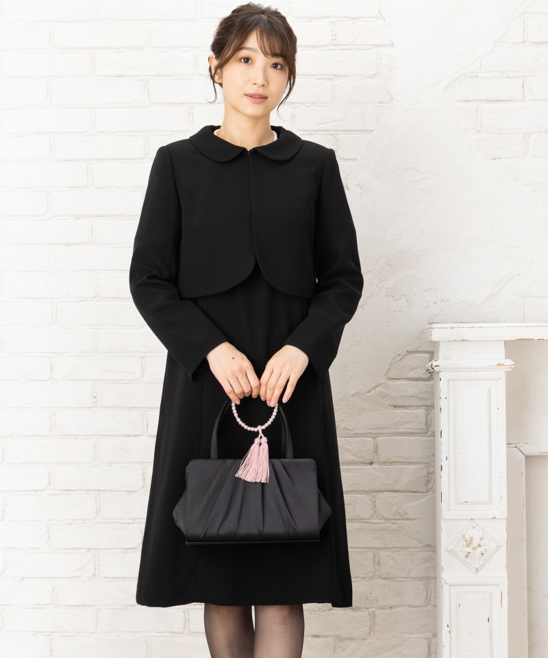 ワンピースは切り替えのないゆったりとしたシルエット。前開きファスナーで着脱も簡単です。お荷物が多い方でも安心の大きめフォーマルバッグを合わせたコーディネートセットです。