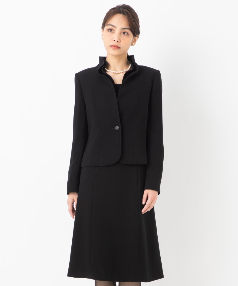 ジャケットとワンピースの両方がフリルネックデザインのWフリルカラーアンサンブルです。二重のフリルがフェミニンかつエレガントなデザインで、年齢を問わず着て頂ける一着です。