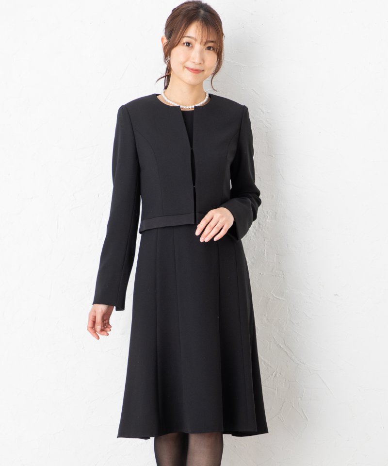 ウエスト部分サテンのパイピングをあしらったコンパクトなノーカラージャケットに、マーメイドデザインに近い立体的なドレープ感のあるフレアワンピースを合わせた、正喪服にふさわしい仕上がりです。