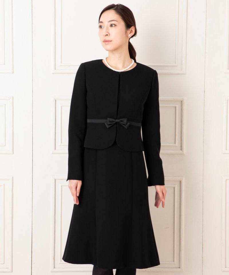 リボンブローチ付きのノーカラージャケットとマーメイドシルエットのフレアワンピースアンサンブルです。裾にかけてふんわりと広がるマーメイドフレアーのワンピースに、ウエストラインにゆるやかに沿うジャケットが美シルエット。
