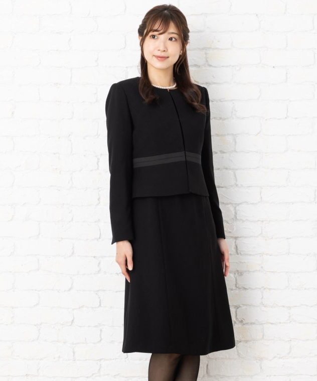 20代~におすすめのブラックフォーマルアンサンブルです。ジャケットとワンピースのアンサンブルで着ていただくと、ベーシックなブラックフォーマルスタイルに。