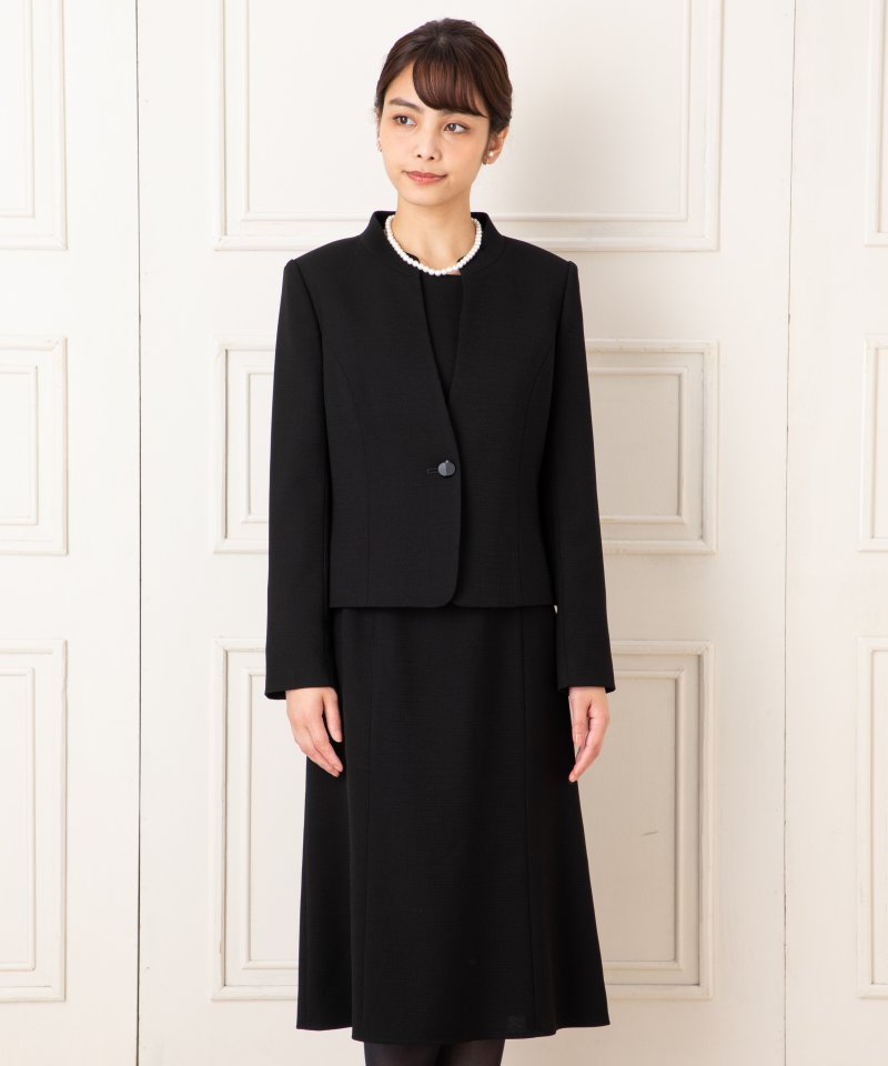 ワンピースはジャケットを合わせたドッキングデザイン、上品できちんとした印象を与えてくれるセミフレアーシルエットは夏のブラックフォーマルにも安心して一枚で着て頂けます。