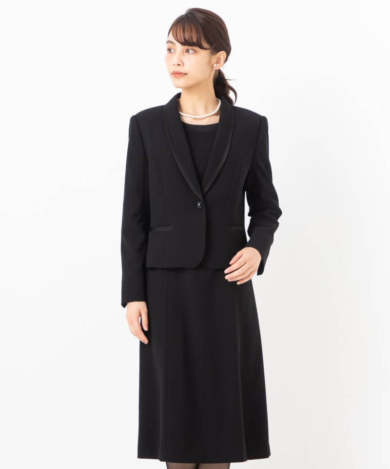 サテン切り替えのショールカラージャケットと前開きワンピースのブラックフォーマルスーツです。