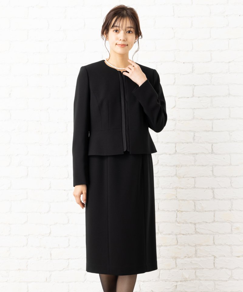 シンプルでスタイリッシュ、着脱が簡単な前開きタイプのブラックフォーマルワンピーススーツです。装飾をなくすかわりに、異素材の切り替えや首元・ウエスト回りに立体的なデザインを施すことで上品な美しさに仕上がりに。