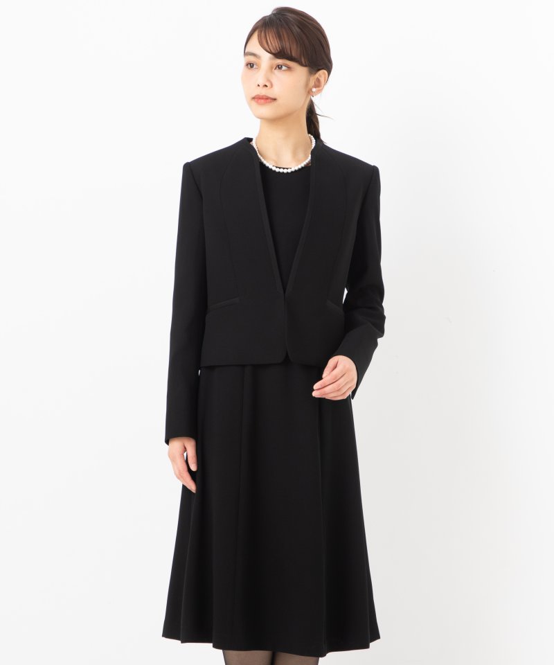 V字スタンドカラーと前開きワンピースのブラックフォーマルスーツです。ジャケットはV字の立ち襟で首元を綺麗に品よくみせてくれます。