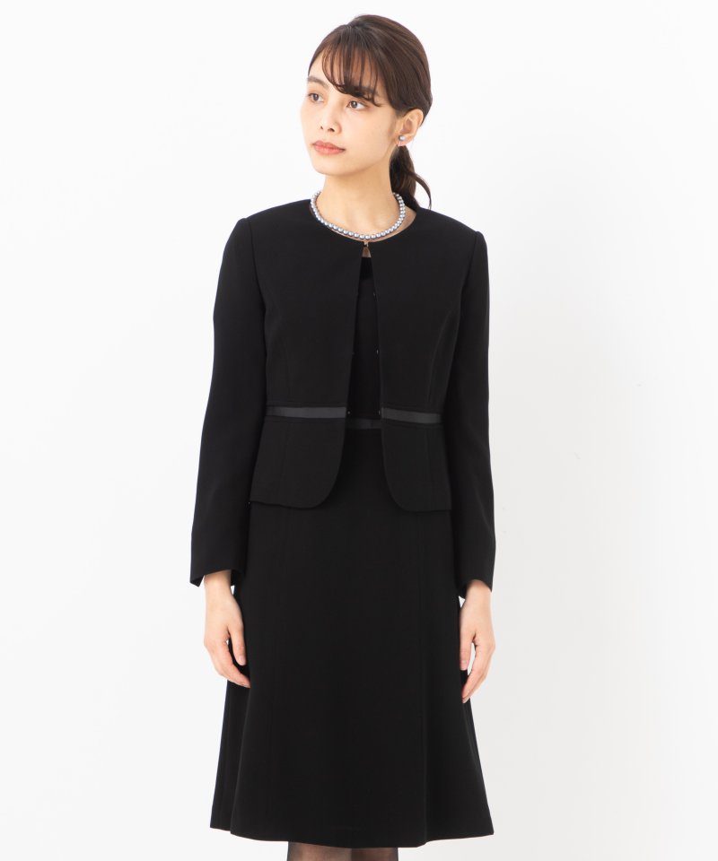 テープリボンをあしらったブラックフォーマルスーツです。軽い着心地ですので、通年ご使用頂けます。