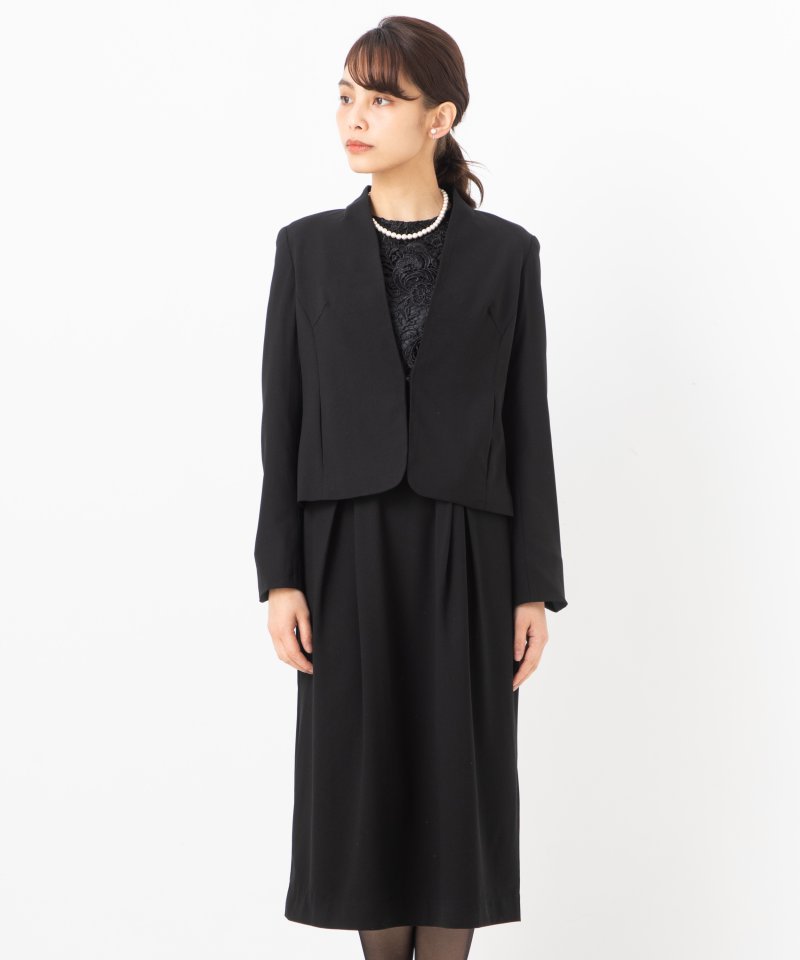 すっきりとしたノーカラージャケットとフラワーレース切り替えワンピースのセットアップです。
