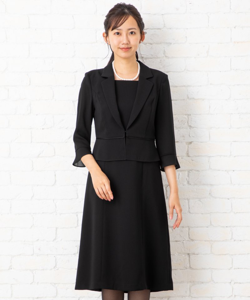 ジャケットとワンピースが一体となった、夏用ブラックフォーマルワンピースです。きちんと感を損なわずにワンピースと同じ感覚着て頂ける一着です。