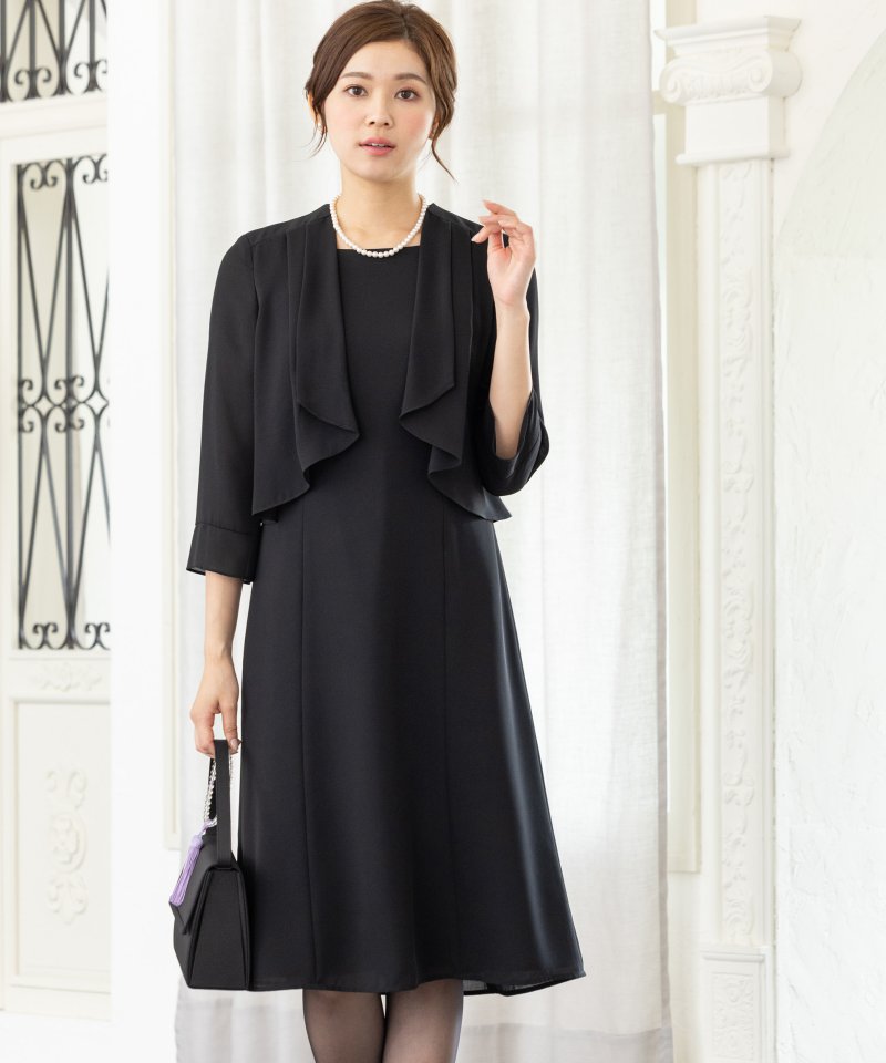 シフォン風のボレロを羽織ったような、涼しげでエアリー感のある春夏用ブラックフォーマルです。