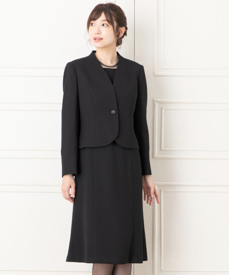 メリハリあるデザインが特徴のブラックフォーマルアンサンブルです。コンパクトに作られたジャケットはバランスがとりやすく、小柄の方にもおすすめのデザインです。