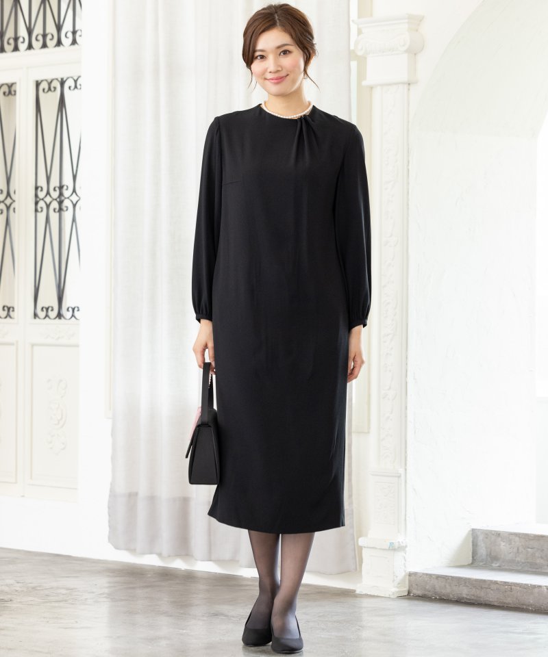 ほどよく立ち上がったセミハイネックの首元はタックを入れてモードな雰囲気に、スカートはすっきりとしたコクーンシルエットで、丈も長めですの着席時でも安心です。