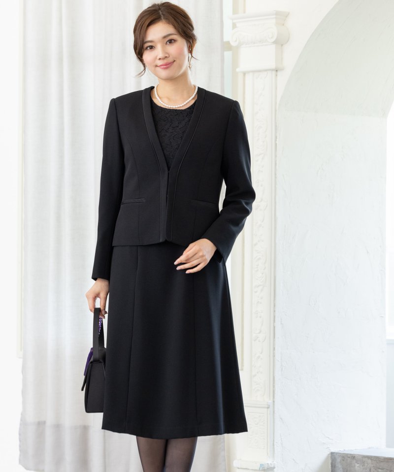 カラーレスジャケットからのぞくレースがエレガントで優し気な印象を与えてくれるブラックフォーマルスーツです。すっきりとしたカラーレスジャケットは近年人気のスタイル。