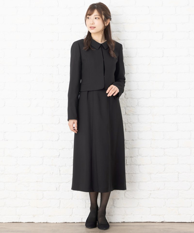 ロング丈ワンピースのブラックフォーマルアンサンブルです。身長170㎝前後の方でも膝がしっかりと隠れるミディアム丈です。