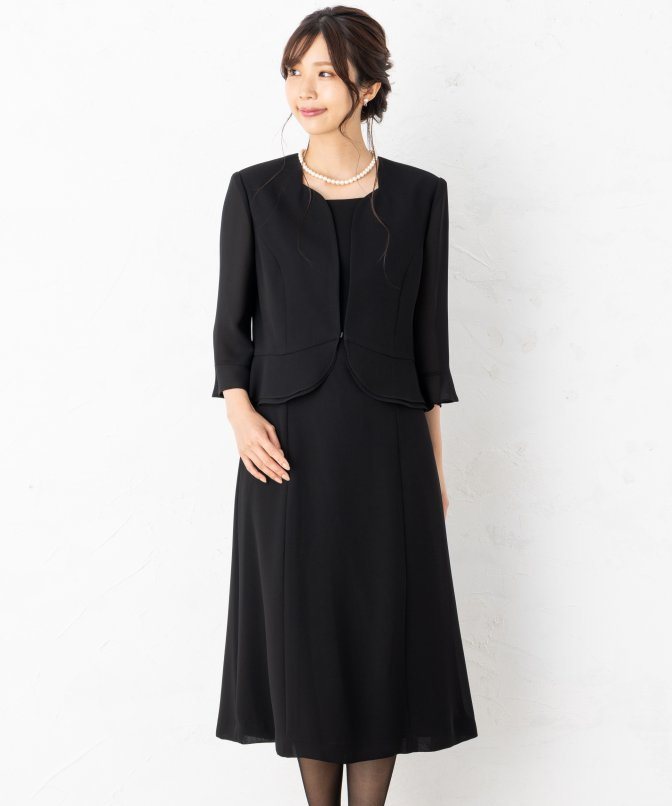 エレガントな装いをお求めの方におすすめの、東京ソワール社製春夏用ブラックフォーマルワンピースです。ペプラムシルエットのボレロは着丈を長めにし、裾にさりげないフリルカットを施すことでウエストまわりをふんわりとカバー。