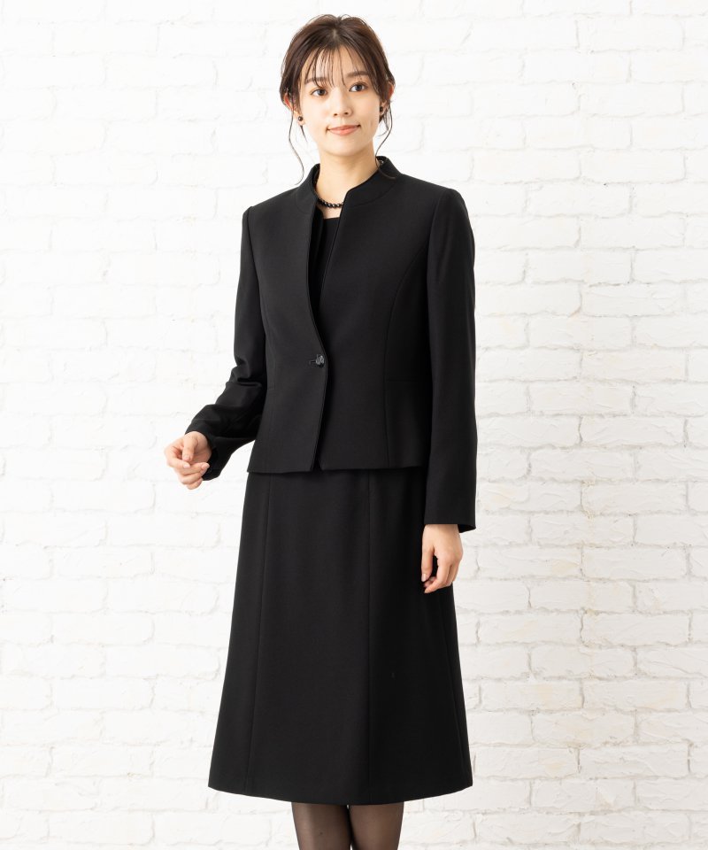 スタンドカラーで肌見えを抑えてエレガントに。キーネックデザインの襟元からウエストにかけてほどよくシェイプされすっきりと着て頂けるアンサンブルです。喪服ながら、スーツの延長で着て頂ける都会的でスタイリッシュなシルエットが特徴。