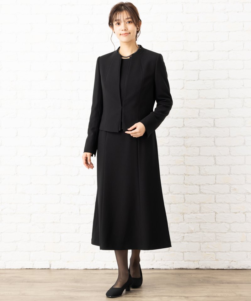 縦のラインを綺麗に見せる、美シルエットのブラックフォーマルアンサンブル。首元の露出を抑えた立襟とロング丈ワンピースで正喪服としてもご着用いただける一着です。