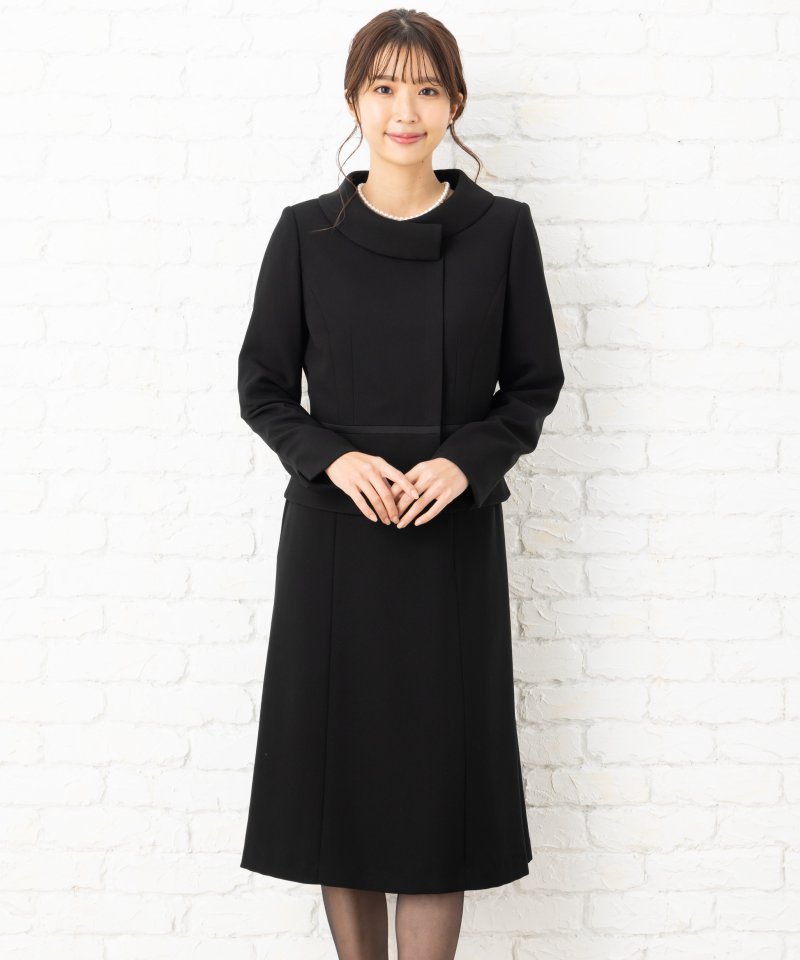 端正でクラシカルな印象を与えてくれるロールカラージャケットのブラックフォーマルアンサンブルです。アシンメトリーの襟は詰まりすぎない絶妙なデザインで配置され、首を細く長く、ネックレスラインを美しく見せてくれます。
