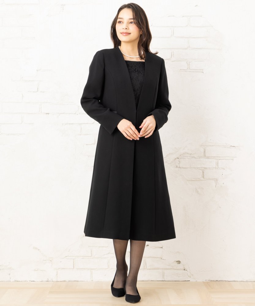 ロングコートを羽織ったかのような、現代的なデザインのブラックフォーマルアンサンブル。慶弔両用で着用いただける一着です。