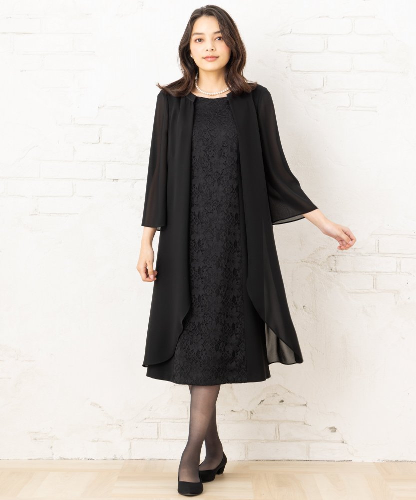 シフォンガウンを羽織ったかのようなエレガントなブラックフォーマルワンピースです。大胆に配した花柄のコードレースワンピースに空気感のあるエアリーなシフォンガウンが高級感を感じさせます。