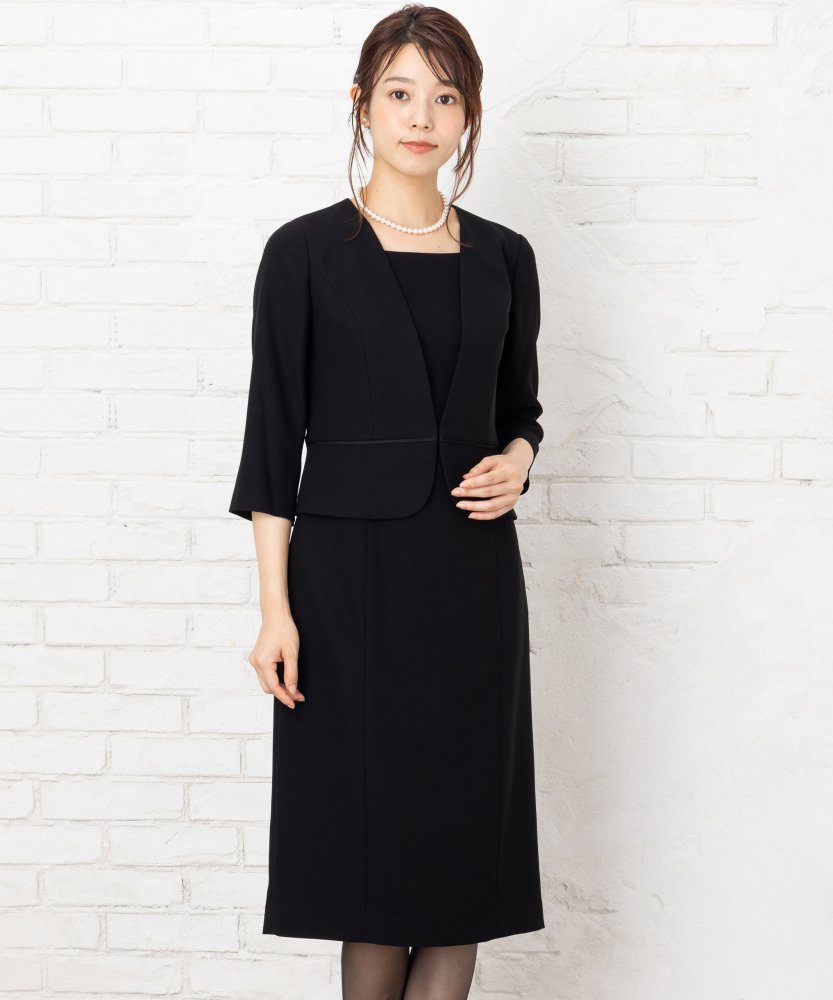 女性らしいIラインシルエットが特徴のエレガントなブラックフォーマルワンピース。ジャケットを羽織ったかのようなドッキングデザインですので、準喪服として着用いただけます。