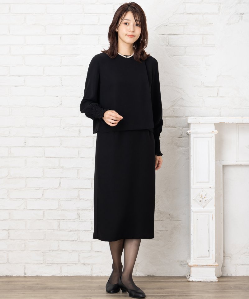 袖のギャザリングデザインが特徴のセットアップ風ブラックフォーマルワンピースです。濃染生地を使用していますので、弔事の席でも安心して着用いただけます。