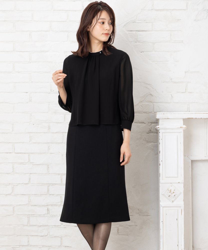 ソワールベニール(東京ソワール)弔事の席でも安心して着て頂ける濃染生地を使用した慶弔両用のブラックフォーマルワンピースです。