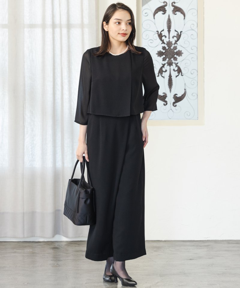春夏~初秋にかけて略喪服として着用いただけるオールインワンスタイルのパンツフォーマルです。肌触りの良いジョーゼット生地を使用することでライトに着ていただける一着。トップ部分は三重に生地を重ねることでブラウスを着ているかのようなデザインに。パンツ部分は中心位置をずらしたラップデザインで、太もものシルエットやYラインを気にすることなく着用いただけます。裏地は吸湿速乾に優れたサップ地を採用し、昨今の高温多湿な環境にも対応しています。