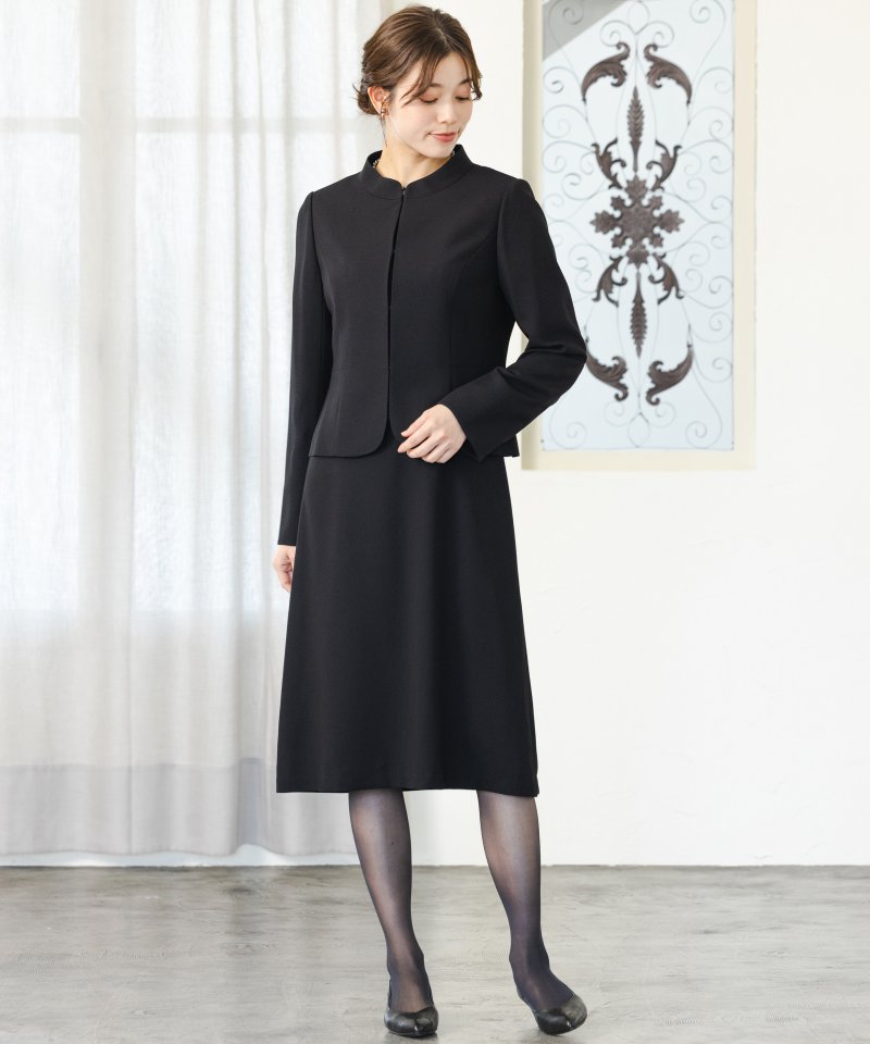 さらりと軽やかに着ていただける正喪服対応のアンサンブルです。ジャケットのスタンドカラーデザインは低い位置から仕立てることで鎖骨を綺麗に見せ、軽やかで凛とした表情をみせてくれます。軽くて柔らかい生地を使用していますので、重い印象を与えることなく着ていただけます。袖丈が長めですので、長身の方にもおすすめです。小柄な方は袖先を折り返して着用いただけます。ワンピースは、ブラウスとスカートを合わせたかのようなセットアップ風デザインです。トップスはブラウス地、スカートはジャケットと共生地をしています。ジャケットを羽織ればアンサンブルに、ジャケットを脱げばセットアップ風ワンピースにガラリと印象を変えてくれます。全体的に細身ですっきりとしたシルエットですので、ミドル世代・キャリア世代におすすめの一着となっています。