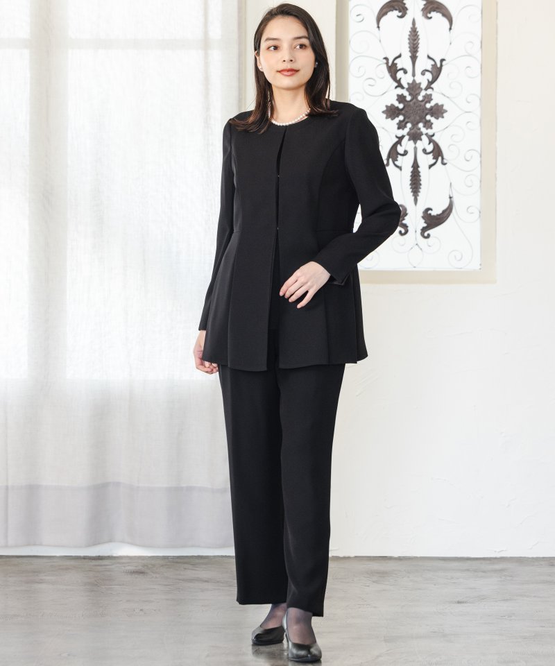 縦にも横にも伸びる4WAYストレッチ素材を使用したパンツタイプのフォーマルスーツです。トップスはブラウスとジャケットを1枚に合わせたドッキング仕立て。一見、インナーとジャケットの重ね着に見えますが、実は1枚で着ることができます。前ホックを留めるとチュニック風に、ホックを開けるとロングジャケット風に。腰からヒップにかかるロング丈ですので体型カバーにも最適です。