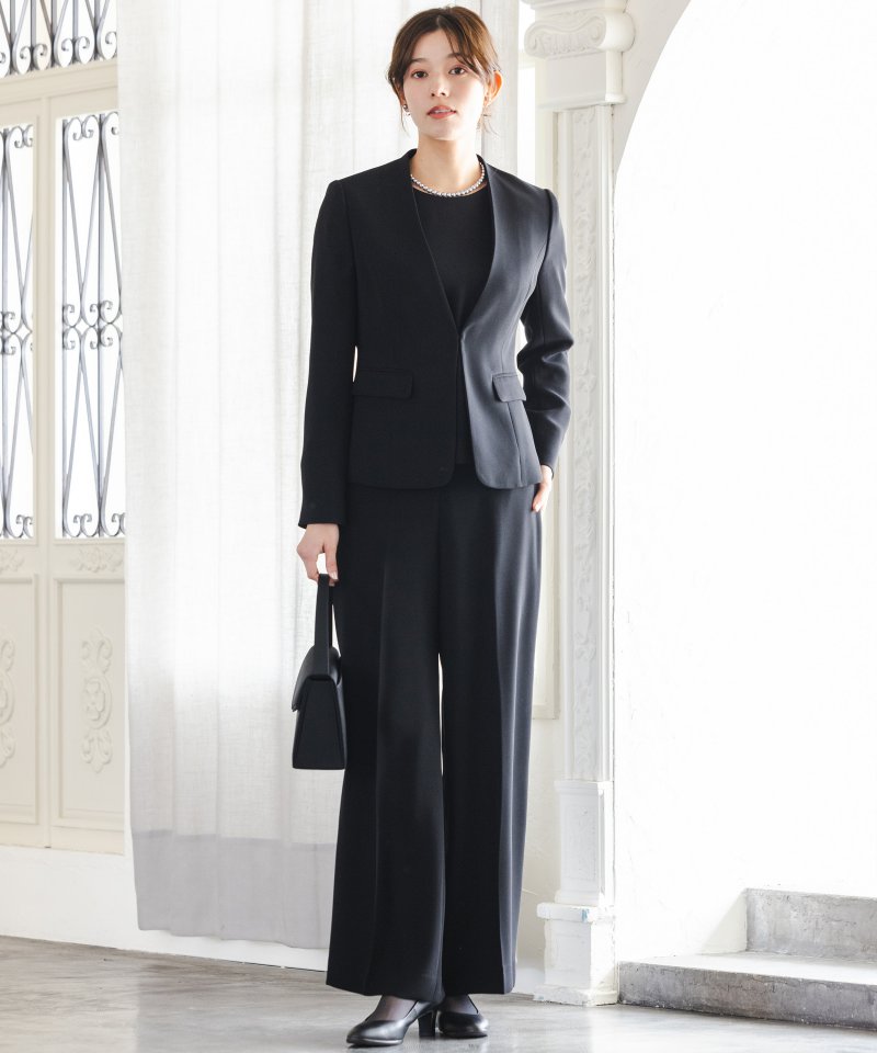 人気のパンツスタイルブラックフォーマルです。ジャケットはやや細身のシルエットで、Vネックのカラーレスデザインとウエストのワンホックでシャープな印象に。ブラックフォーマルにはめずらしく、両サイドにはポケット付きで機能面も兼ね備えています。