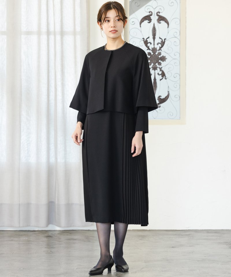 ジャケットは肩やウエストに切り替えがないポンチョ風のシルエットで、体を締め付けることなくゆったりと着ていただけます。袖はフレアのショートスリーブで、中からワンピースの袖先がのぞくレイヤードデザイン。ワンピースは両サイドをシフォンプリーツにすることで、フリーサイズでも着ぶくれせずメリハリ感をプラスしてくれます。ラグランスリーブ風のショルダーラインですので、肩幅のある方、厚みのある方でも窮屈感がなく快適な着心地です。慶弔両用で着ていただけ、マタニティ用としてもおすすめの一着です。