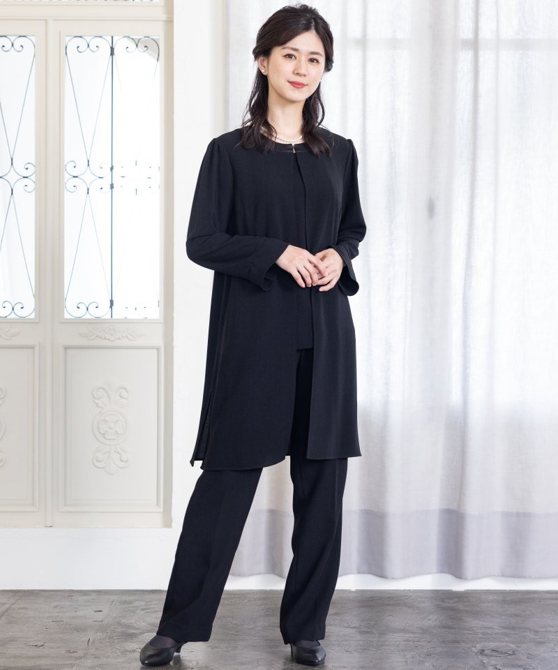 涼し気な印象を与えてくれるブラウスカーディガンのパンツフォーマル。とろみのある生地を使用し、落ち感から生まれるドレープがエレガントです。インナーとカーディガンが一体となったドッキングデザインは、汗ばむ季節でも楽に着ることができます。前開きファスナーですので着脱も簡単。裏地には吸湿速乾に優れたサップ地を採用しています。