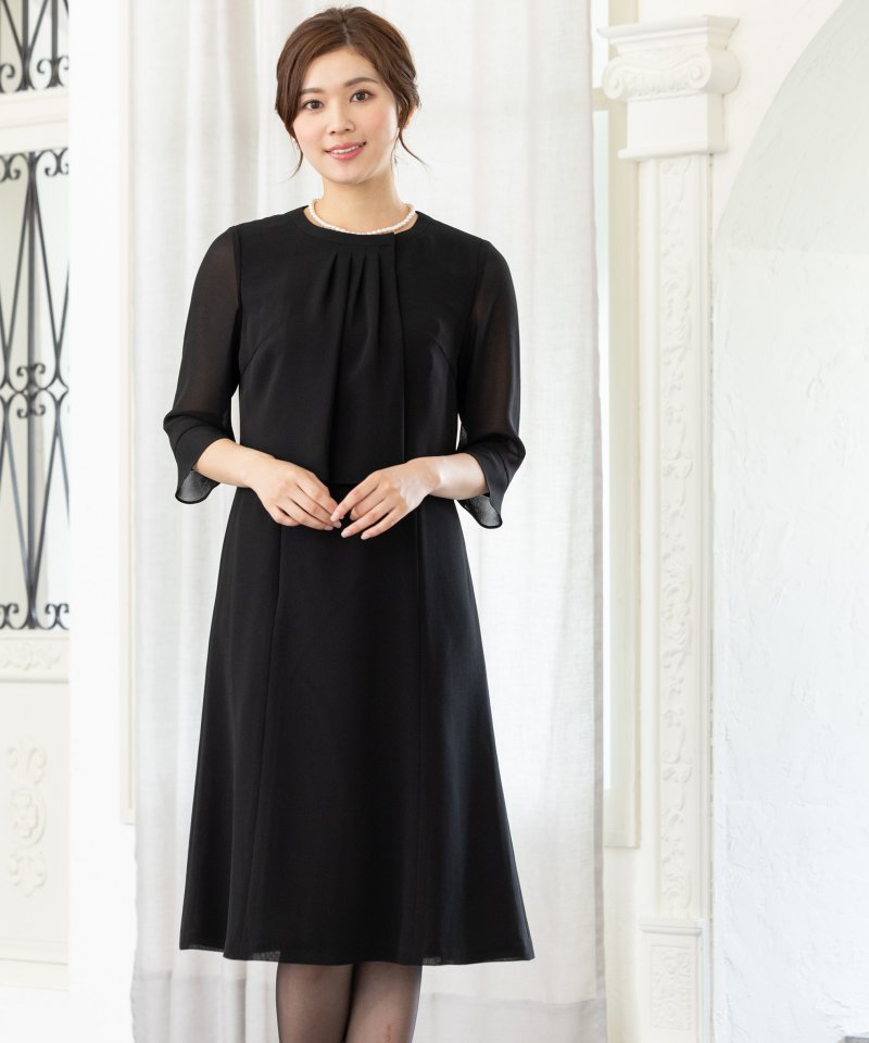 胸元のタックから生まれるふんわりとしたドレープがフェミニンなワンピースです。ブラウスワンピースのような軽い着心地と空気を含んだようなエアリーなトップデザインが特徴。トップはブラウス風にふんわりと、対してスカート部分はシンプルなスムース地で一見異素材と思えるかもしれませんが、同素材を使用していますので準礼装・準喪服に対応します。もちろん濃染の深く濃い黒生地ですので、マナー面でも安心いただけます。