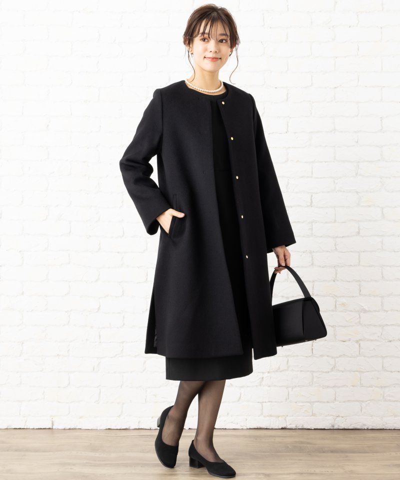 金ボタンを比翼(隠しボタン)にあしらった慶弔両用で着用いただける冬用コートです。ボタンを閉めれば弔事用に、ボタンを開けて慶事用としても着ていただけます。