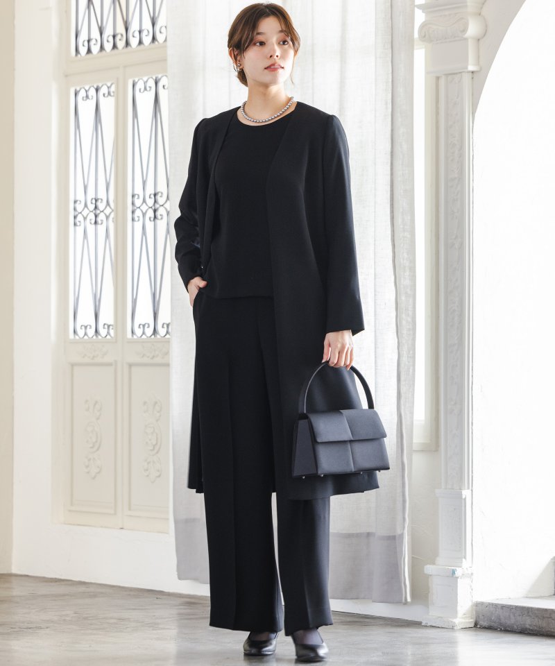 裾にスリットが入っていますので、足さばきも良く、シルエットを崩さずに着用いただけます。モデル:身長167㎝・Mサイズ着用