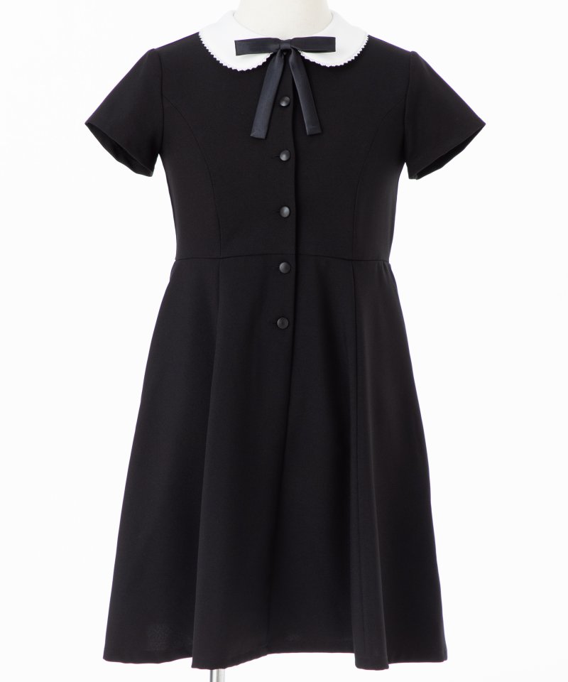 女の子らしさ溢れる丸襟をあしらった、ブラックフォーマルワンピースです。シックにまとまったデザインで、夏の弔辞シーンで着て頂ける一着です。