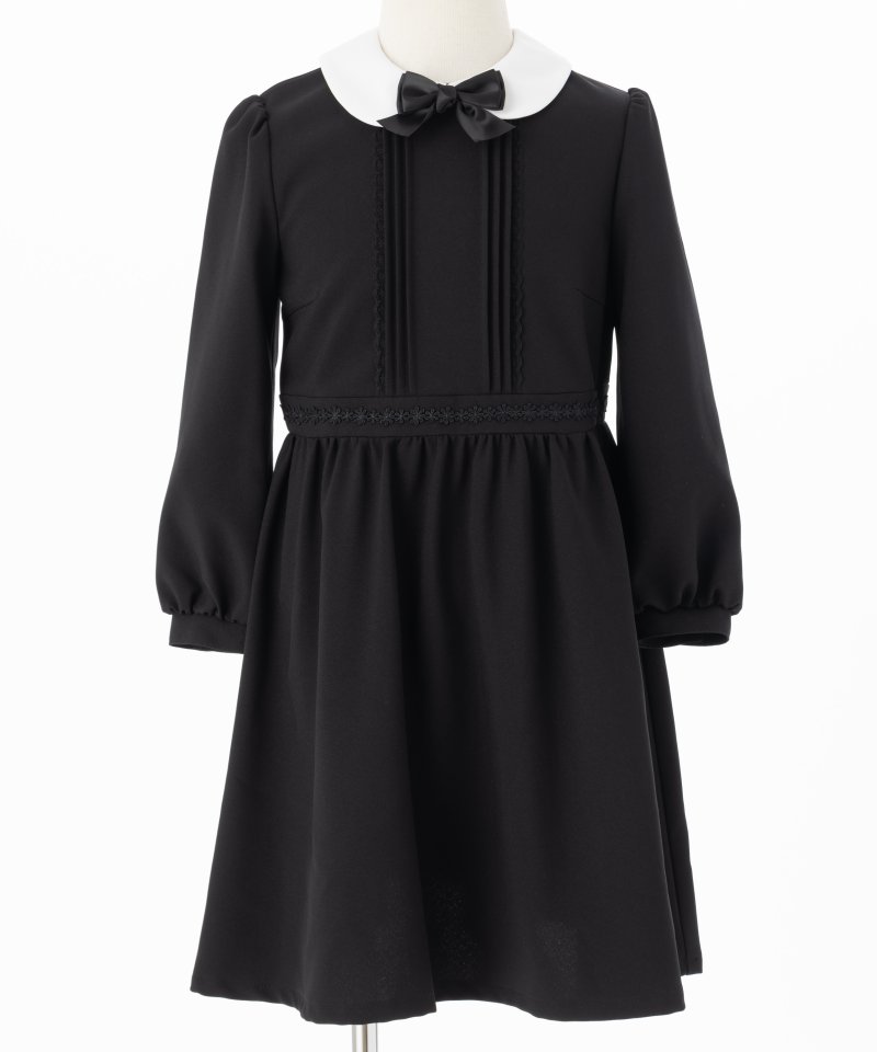 丸襟ブラウスをコーディネートしたかのような可愛らしいワンピース。ウエストにはお花をモチーフにしたフラワーリボンテープをあしらっています。袖先にギャザーを入れることでコロンとした丸みのあるシルエットが生まれ、可愛らしさもプラス。